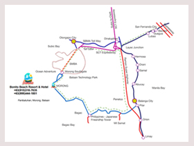 Take NLEX, merge with SCTEX ( Subic Clark Tarlac Expressway). Go all the way to Subic. Exit at Tipo Subic . Go inside SBMA, follow the highway running parallel to Subic Bay at the right, pass the airport, follow the sharp left curve of the road at the end of the airport compound, pass Triboa Bay (APEC Villas, follow the winding road until you exit SBMA via its South (Morong) Gate.